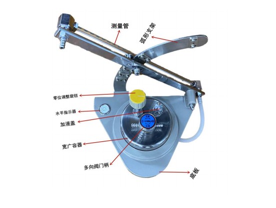 2.旋開正力容器上的加液蓋,緩慢加入密度為0.810克/立方厘米的酒精,(95%的酒精)使其液面在傾斜測量管上的刻線在零點附近,然后把加液蓋旋緊,將閥門撥在“測壓”處,用橡皮管接在閥門“+”壓接頭上,用壓氣球輕吹橡皮管,使傾斜測量管內液面上升到接近于頂端處,排出存留在正壓容器和傾斜測量管道之間的氣泡,反復數次,直至氣泡排盡。